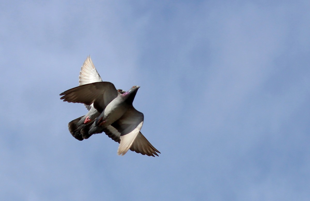 On a bright May morning, I sat outside with a cup of coffee, rejoicing in the exuberant bluster of a gang of goldfinches scrapping over a container of Niger Seeds, when a pair of pigeons began their aerial mating dance. They shot high into the air, twisted, turned, stunted and dived as if they were writing love messages in the sky, not as graceful as larks ascending but more ardent.