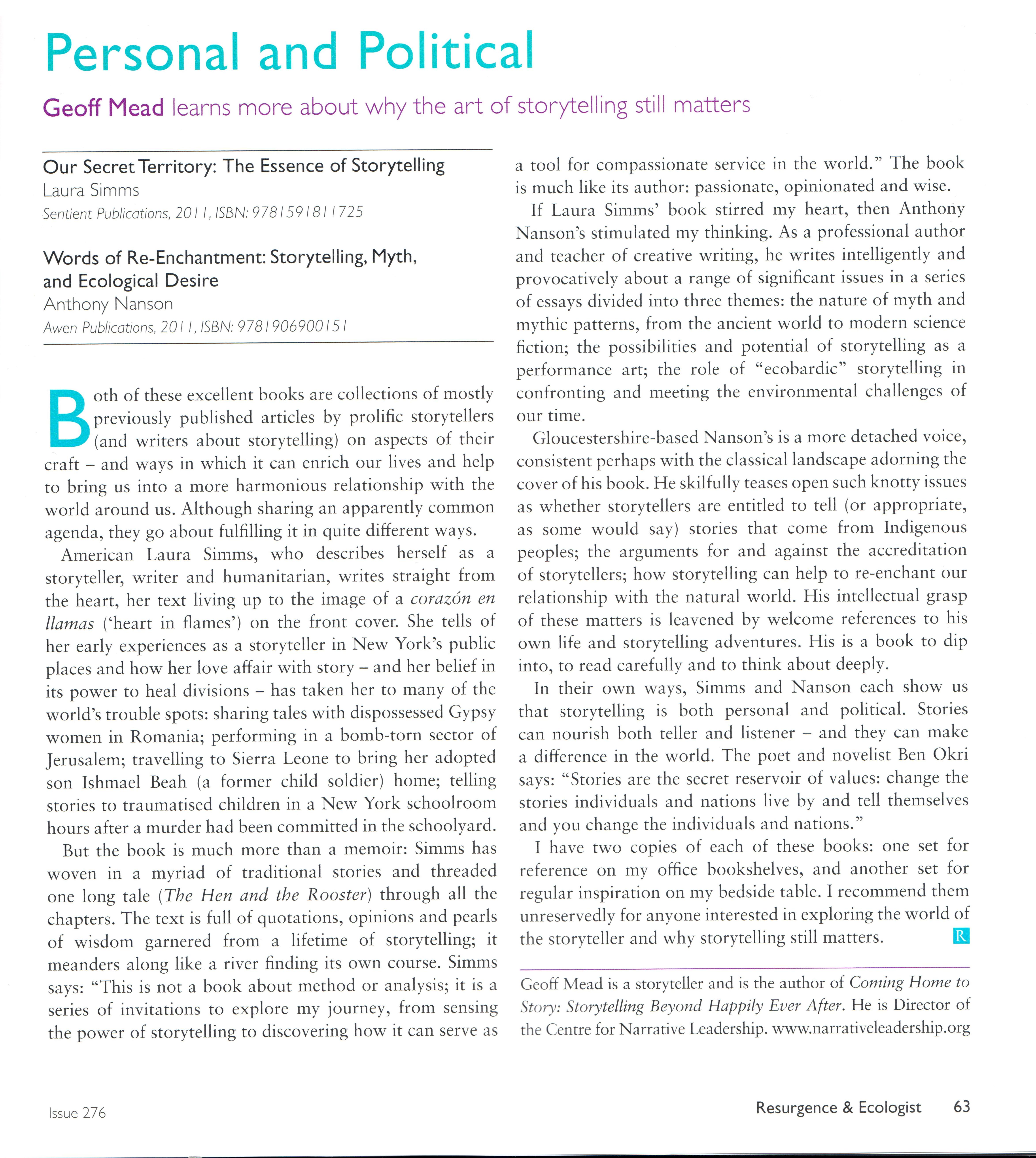 Last year I was invited to write a review for Resurgence & Ecologist Magazine of two new excellent books about storytelling by American storyteller Laura Simms and by Stroud-based Anthony Nanson. It appeared in the January 2013 edition.I hope that readers of this blog might be interested to read it – and the books themselves!